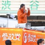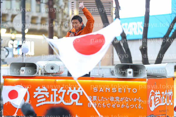 【参政党:PasyaImages:2月1日】参政党の神谷宗幣代表が、東京・渋谷駅で選挙演説を行った。演説を見に来た人々に応える様子。