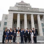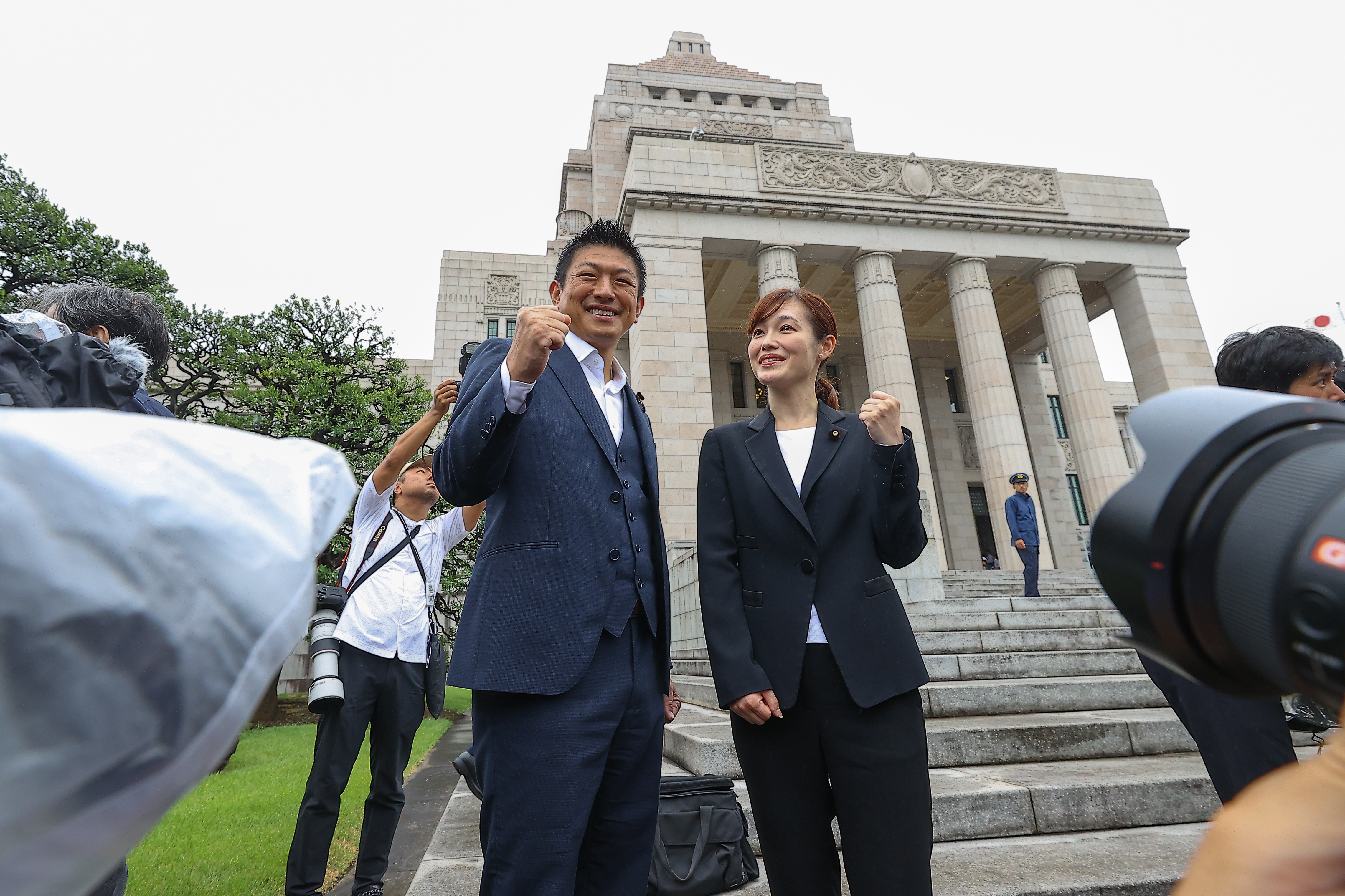 【第218臨時国会:PasyaImages:8月1日】石破茂、総理大臣が衆議院会議に出席。第218臨時国会が開幕。国政政党の参政党。神谷宗幣党首、初当選の議員14人、衆議院議員3名、18名全員での国会議事堂での記念撮影。
