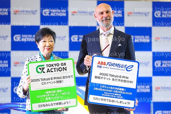 【TOKYO ZEV ACTION:PasyaImages:2月10日】東京都の小池百合子都知事、ジェフ・ドッズ フォーミュラEオペレーションズCEOが来日、新宿の都庁舎内のフォーミュラE東京大会PRブースのオープンングセレモニーに出席。